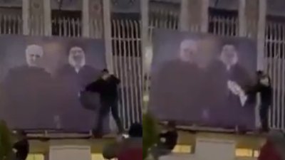 In the clip circulating on Musk's X (formerly known as Twitter), a Syrian resident was seen climbing up the Iranian embassy's wall and trying to tear down a huge Nasrallah and Qasem Soleimani poster.