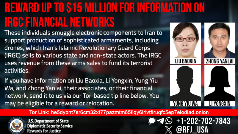 ALBAWABA - The US Department of State’s Rewards for Justice is offering up to $15 million as a reward for information about individuals supporting Iran's IRGC (Islamic Revolutionary Guard Corps), naming several Chinese nationals as the target.