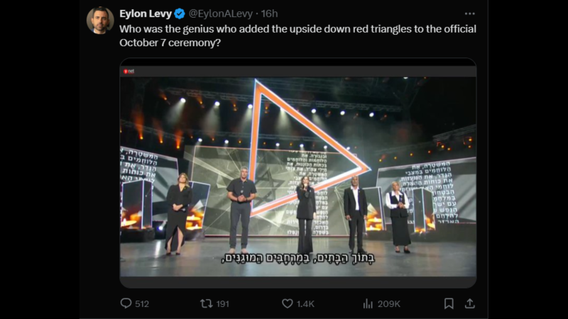 Levy wrote, "Who was the genius who added the upside-down red triangles to the official October 7 ceremony?" The ceremony took place on Oct.7, 2024, in reference to the Israeli hostages taken by the Palestinian military group Hamas, during its Al-Aqsa Flood operation.