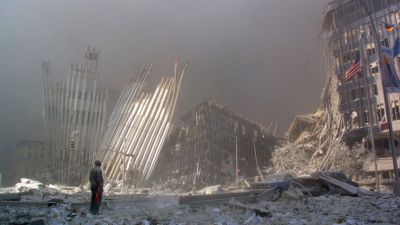 A man stands among the rubble after the collapse of the first World Trade Centre Tower in New York City on September 11, 2001. Photo: AFP