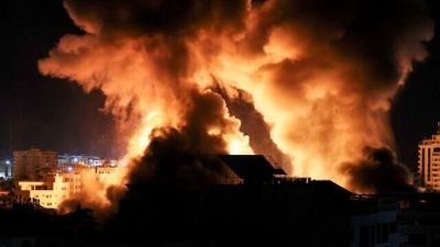 Explosions light-up the night sky above buildings in Gaza City as Israeli forces carry out styrikes on the Palestinian enclave, early on May 18, 2021. (Photo by MAHMUD HAMS / AFP) (Photo by Mahmud hams / AFP)