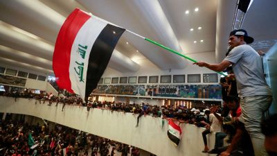 Al Sadr supporter waves flag inside Iraqi Parliament