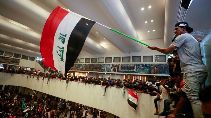 Al Sadr supporter waves flag in ransacked Iraqi Parliament on 30 July (AFP)