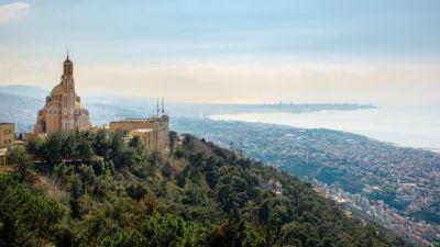 Our Lady of Lebanon Maronite church sits on a hill over the Jounieh bay, with Beirut capital city in the background, in Lebanon, Middle East-Shutterstock