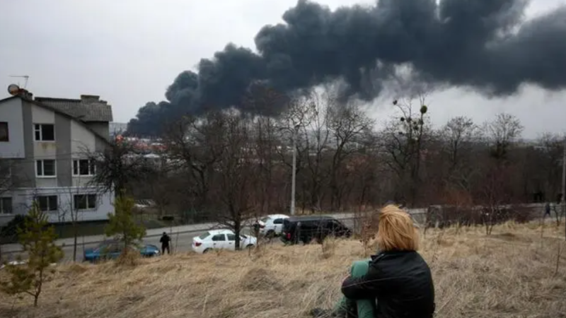 A youth sits on the top of a hill watching dark smoke and flames rising from a fire following an air strike in the western Ukrainian city of Lviv, on March 26, 2022. At least five people wounded in two strikes on Lviv, the regional governor said, in a rare attack on a city that has escaped serious fighting since Russian troops invaded last month. (Photo by Aleksey Filippov / AFP)