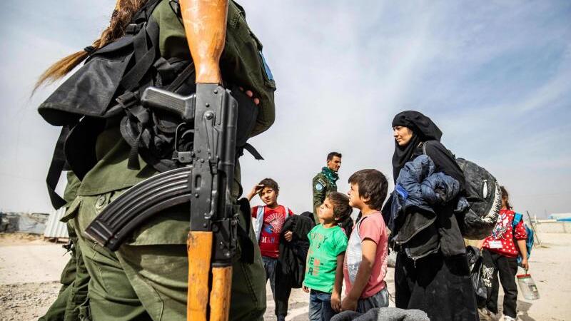 A Kurdish fighter looks on as Syrian women and children, suspected of being related to Islamic State (ISIS) group fighters, gather at the Kurdish-run al-Hol camp, on October 28. (AFP)