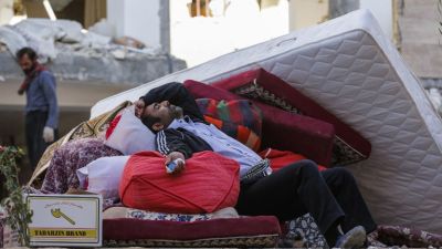 An Iranian man rests as he lies atop salvaged mattresses and items outside damaged buildings in the town of Sarpol-e Zahab near the border with Iraq following a 7.3-magnitude earthquake that left hundreds killed and thousands homeless.