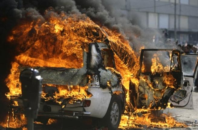 Supporters of the Future Movement torch the vehicle belonging to the Arabic language al-Jazeera satellite television station during a demonstration in support of the caretaker prime minister Saad Hariri in the Sunni bastion coastal city of Tripoli.
