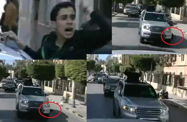 Fist-air-punching Gaddafi on his latest public outing:– his boy supporter falls flat from the Gaddafi-car-mobile, and Gaddafi only momentarily glances at him before carrying on thumping the air, unfazed.