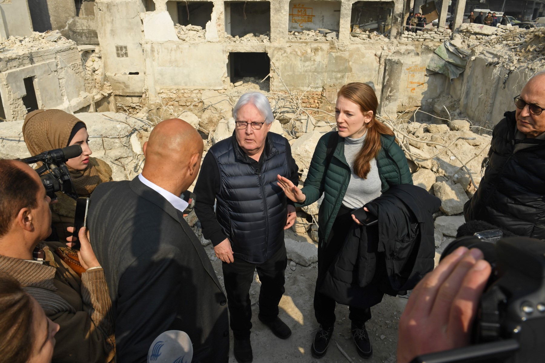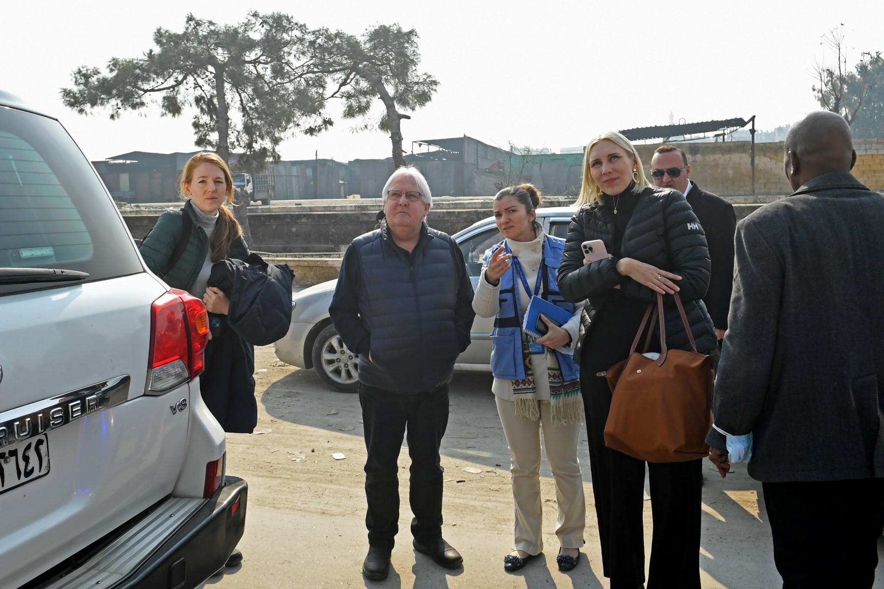 Martin Griffiths, UN Under-Secretary General for Humanitarian Affairs and Emergency Relief, visits the affected neighbourhoods in the city of Aleppo on February 13, 2023 following a devastating 7.8-magnitude earthquake rocked Turkey and Syria. (Photo by AFP)