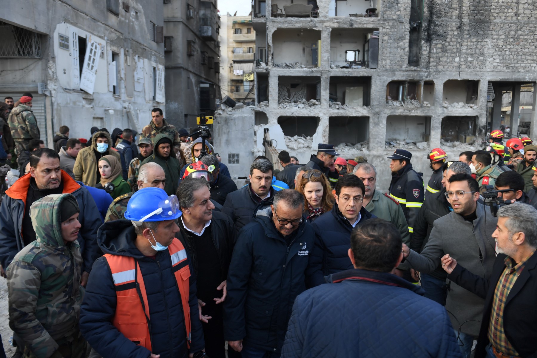 WHO director Tedros Adhanom Ghebreyesus (C-L) visits an area in the northern city of Aleppo on February 11, 2023, days after a deadly earthquake hit Turkey and Syria. (Photo by AFP)