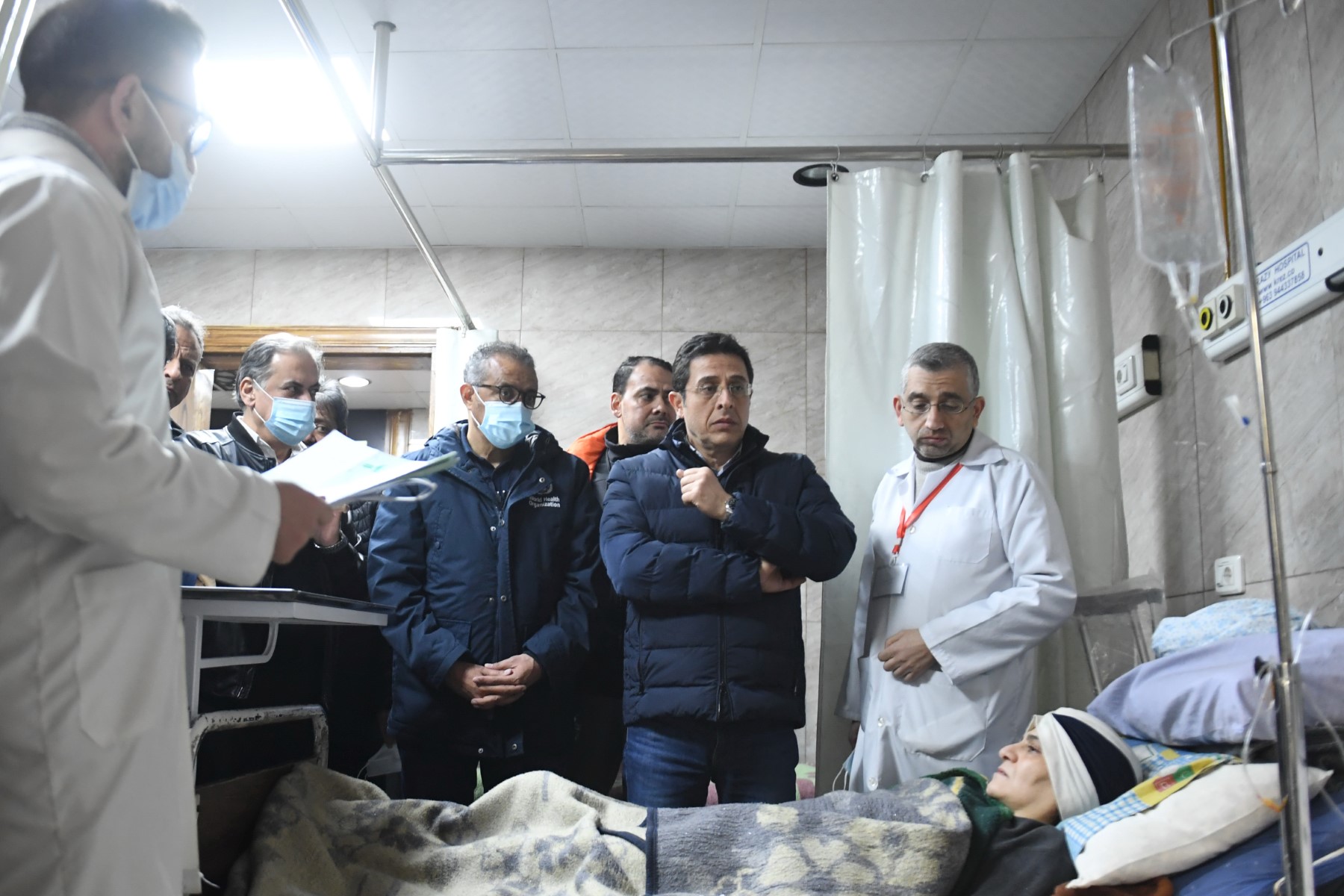 WHO director Tedros Adhanom Ghebreyesus (C-L), accompanied by Syrian Health Minister Hassan al-Ghabash (C), visits a wounded woman at a hospital in the northern city of Aleppo on February 11, 2023, days after a deadly earthquake hit Turkey and Syria. (Photo by AFP)