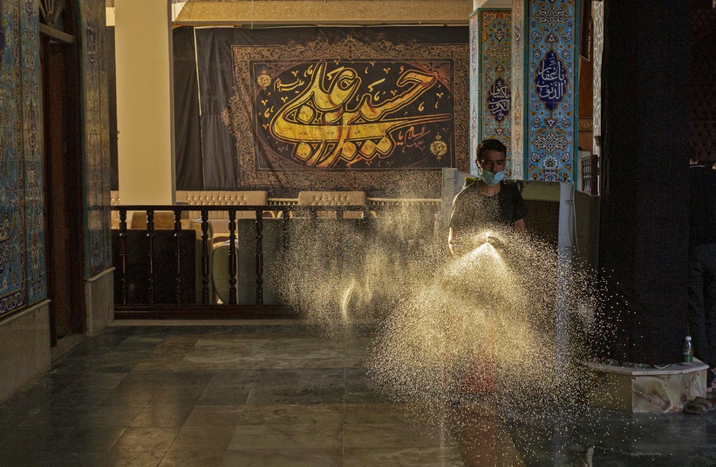 An Iraqi man disinfects a mosque on August 20, 2020, as Muslim Shiites start marking Ashura under new health guidelines to limit the risk of exposure to Covid-19 virus. Hussein FALEH / AFP