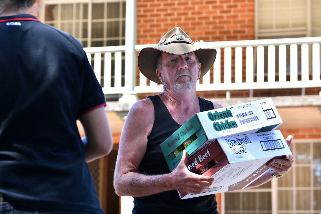 A local resident helps out members of the State Emergency Service to load relief goods onto boats at a flooded residential area in the Windsor suburb of northwestern Sydney on March 24, 2021, after torrential downpours have lashed Australia's southeast for days. Saeed KHAN / AFP