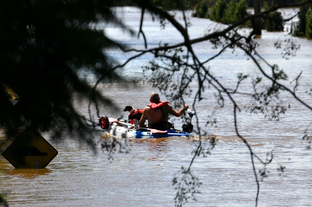 A resident makes his way through floodwaters with his dog in the Windsor suburb of northwestern Sydney on March 24, 2021, after torrential downpours have lashed Australia's southeast for days. Saeed KHAN / AFP