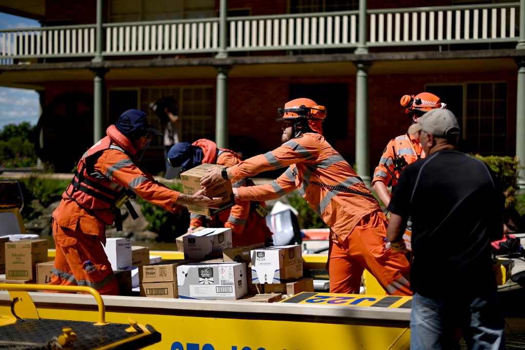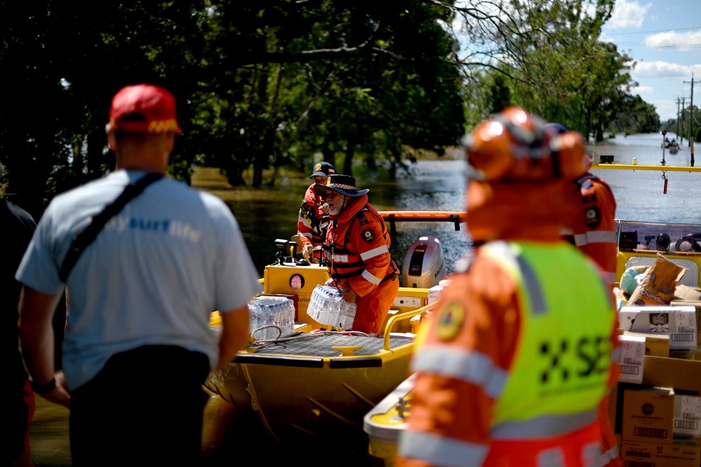 Members of the State Emergency Service loads relief goods onto boats during rescue operations at a flooded residential area in the Windsor suburb of northwestern Sydney on March 24, 2021, after torrential downpours have lashed Australia's southeast for days. Saeed KHAN / AFP