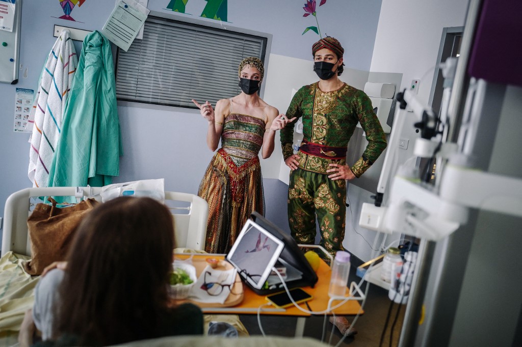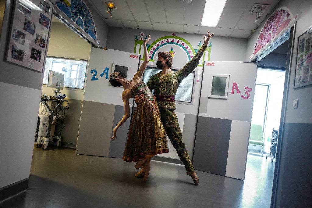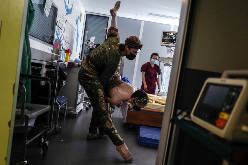 French Etoiles (star dancers) of the Paris Opera Ballet Hugo Marchand and Dorothee Gilbert dance for ill children at the intensive care child unit of the Hopital Necker-Enfants Malades AP-HP in Paris, on June 11, 2021. Lucas BARIOULET / AFP