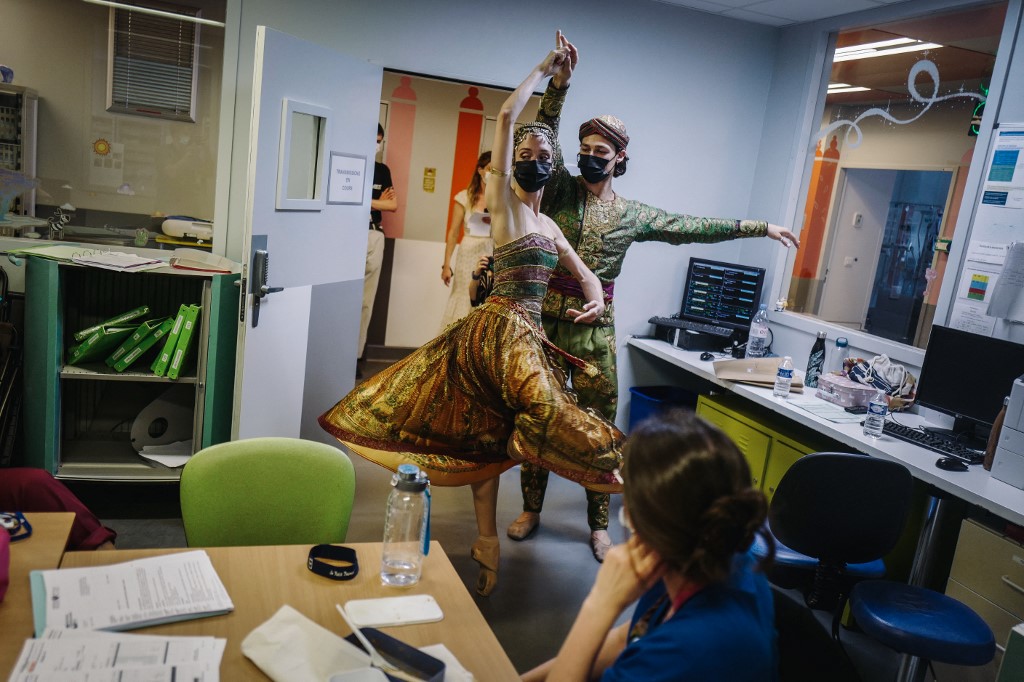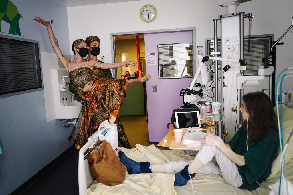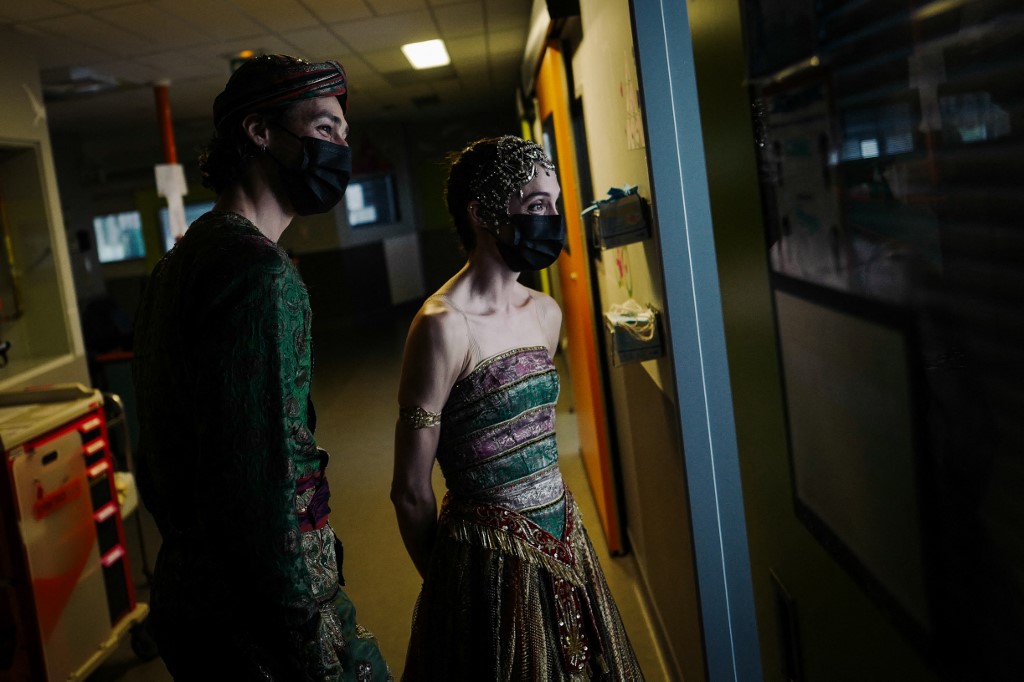 Two star dancers from the Paris Opera seen performing in front of kids in shimmering costumes. as the are children seen watching from an intensive care unit.