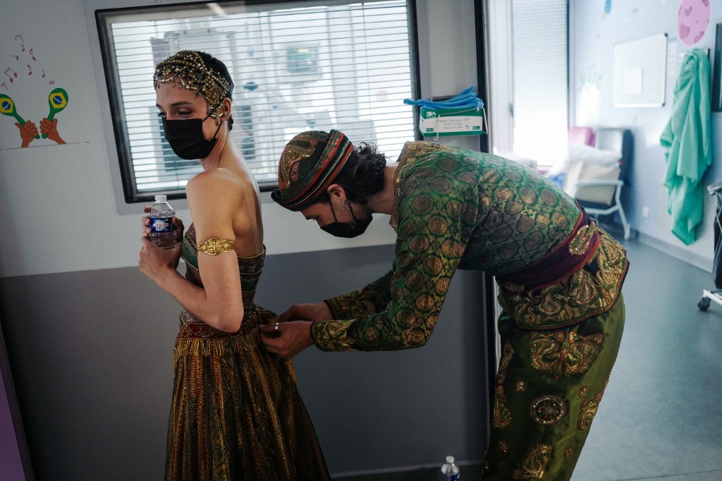 French Etoiles (star dancers) of the Paris Opera Ballet Hugo Marchand and Dorothee Gilbert prepare themselves before dancing for ill children at the intensive care child unit of the Hopital Necker-Enfants Malades AP-HP in Paris, on June 11, 2021. Lucas BARIOULET / AFP