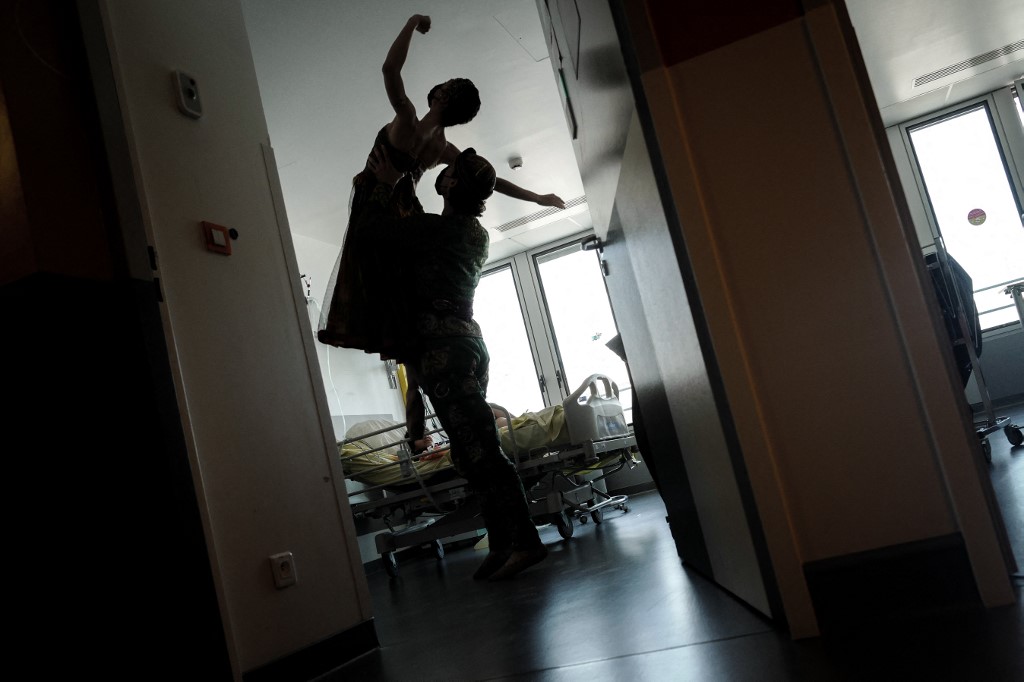 French Etoiles (star dancers) of the Paris Opera Ballet Hugo Marchand and Dorothee Gilbert dance for nurses at the intensive care child unit of the Hopital Necker-Enfants Malades AP-HP in Paris, on June 11, 2021. Lucas BARIOULET / AFP