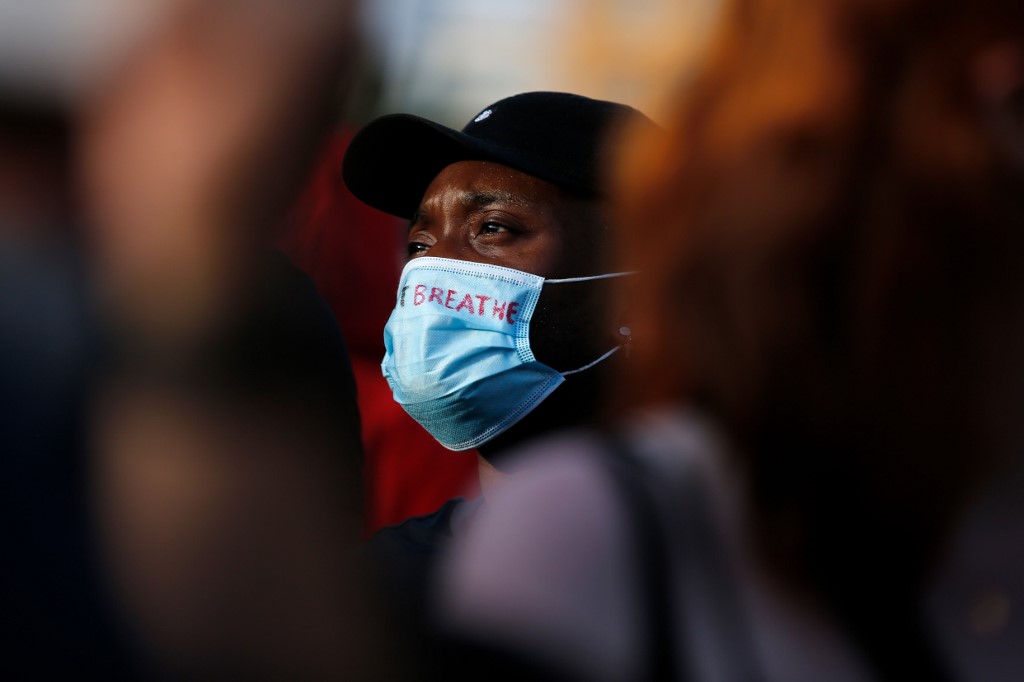 People chanting 'I can't breathe,' the words Floyd gasped as a white police officer knelt on his neck in Minneapolis, Minnesota, last Monday.