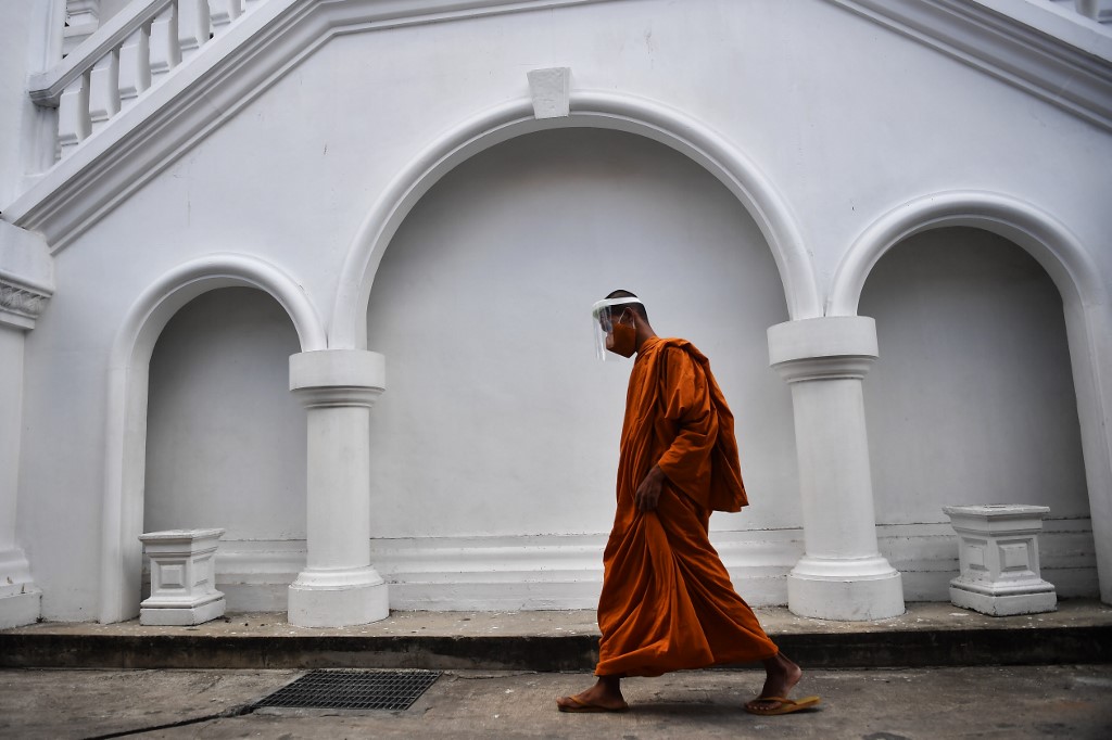 A novice monk wearing a face shield as a preventive measure against the spread of the COVID-19 coronavirus walks through Wat Molilokkayaram Buddhist temple in Bangkok on April 20, 2020. Lillian SUWANRUMPHA / AFP