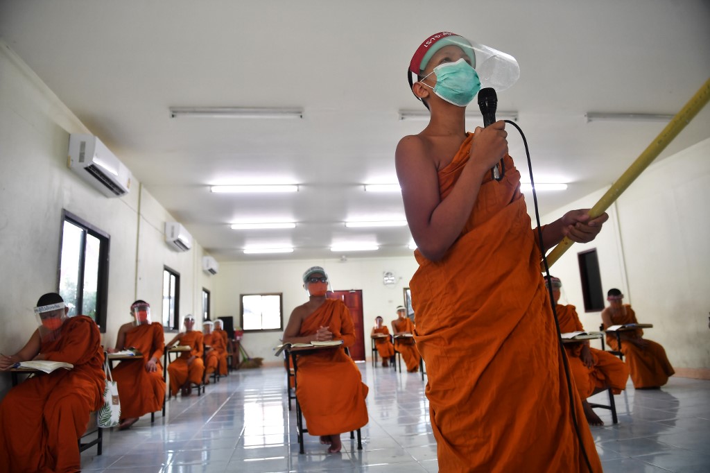 Novice monks wearing face shields as a preventive measure against the spread of the COVID-19 coronavirus attend religious studies at Wat Molilokkayaram Buddhist temple in Bangkok on April 20, 2020. Lillian SUWANRUMPHA / AFP