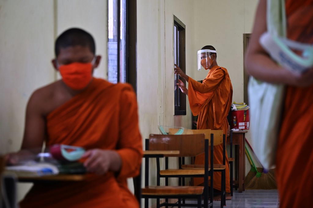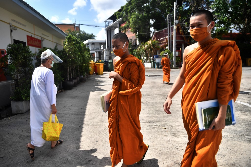 Novice monks wearing face shields as a preventive measure against the spread of the COVID-19 coronavirus leave the classroom after religious studies at Wat Molilokkayaram Buddhist temple in Bangkok on April 20, 2020. Lillian SUWANRUMPHA / AFP