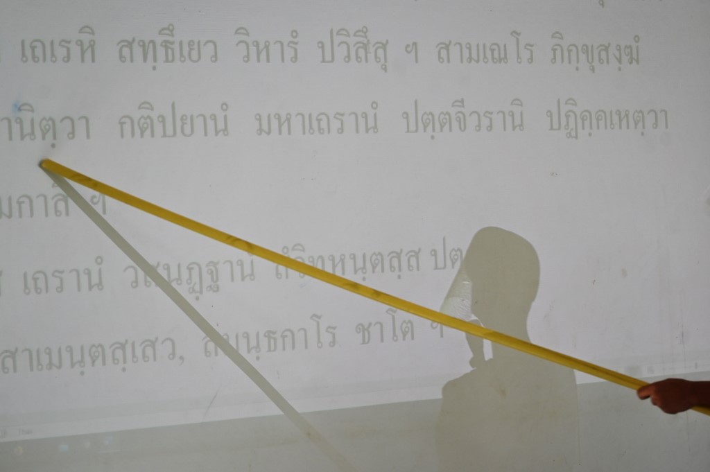 A novice monks wearing a face shield as a preventive measure against the spread of the COVID-19 coronavirus reads religious text off a projection during religious studies at Wat Molilokkayaram Buddhist temple in Bangkok on April 20, 2020. Lillian SUWANRUMPHA / AFP