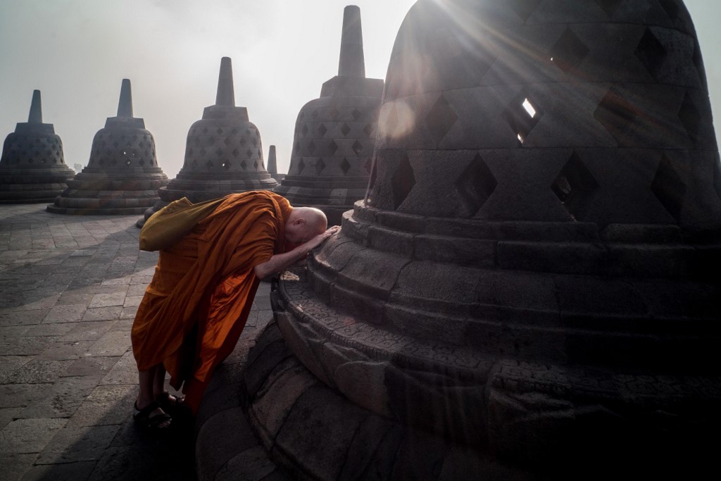 Buddhist monk prays on the eve of Buddha's birthday also known as Vesak celebrations, at Borobudur temple in Magelang, Central Java province, on May 18, 2019. Buddhists are celebrating Vesak, which commemorates the birth of Buddha, his attaining enlightenment and his passing away on the full moon day of May which falls on May 18 this year. OKA HAMIED / AFP