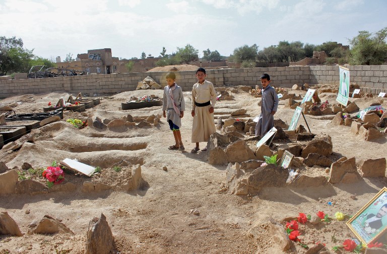 Yemeni children stand by the graves of schoolboys who were killed while on a bus that was hit by a Saudi-led coalition air strike on the Dahyan market in August, at a cemetery in the Huthi rebels' stronghold province of Saada on September 4, 2018. STRINGER / AFP