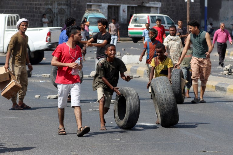 Yemeni children push tyres in Crater, on September 6, 2018 Saleh Al-OBEIDI / AFP