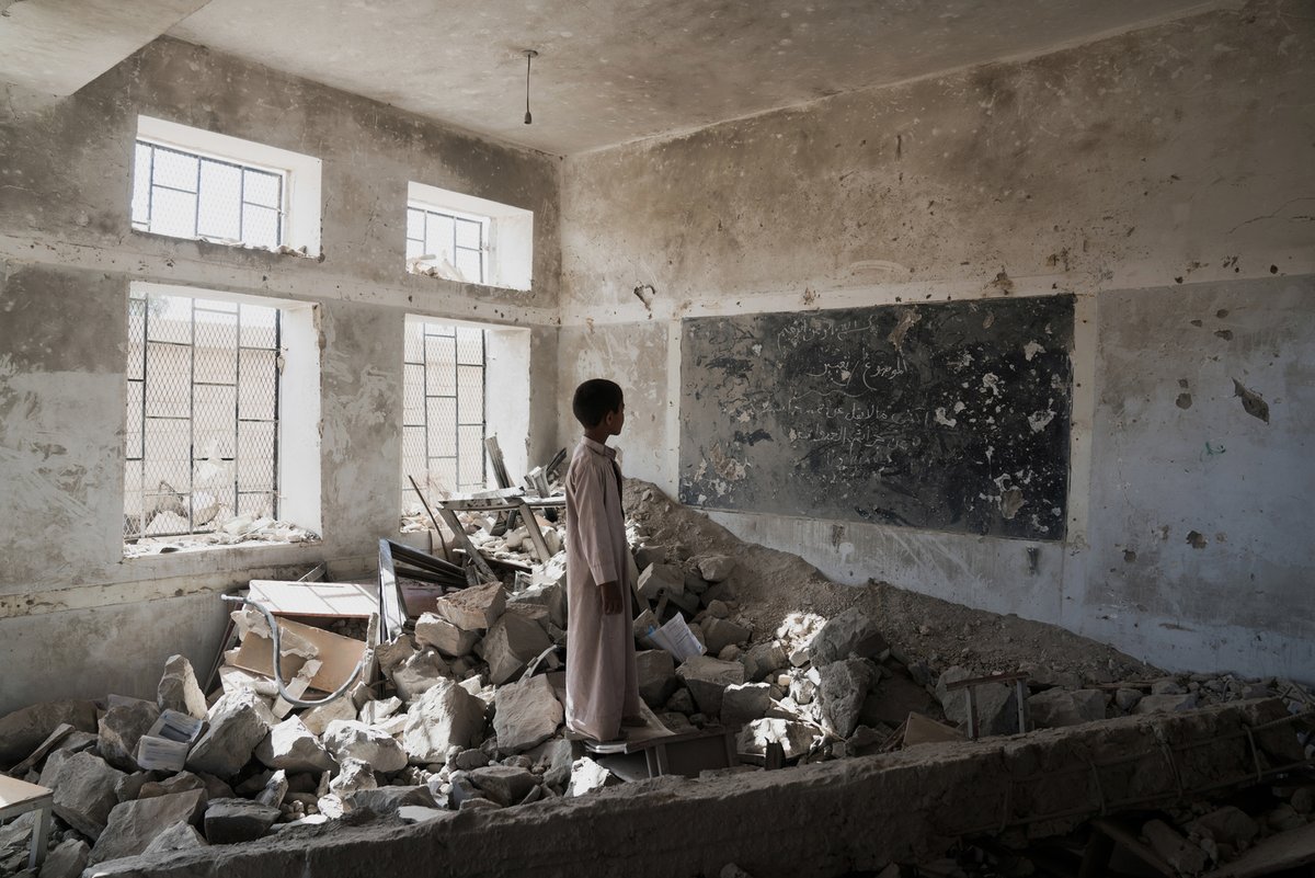 A pupil stands in the ruins of his former classroom, destroyed in June 2015 (Twitter)