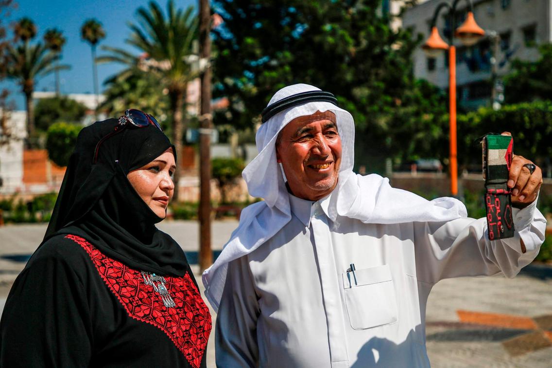 A Palestinian man takes a "selfie" on Palestinian traditional customs day, in Gaza City. AFP