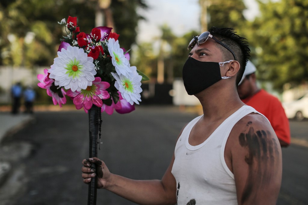 A Catholic faithful smeared in burnt oil and wearing a cross takes part in the opening of the ten-day celebration of the Santo Domingo de Guzman festival, outside the Las Sierritas de Santo Domingo church in Managua, on August 1, 2020 amid the COVID-19 novel coronavirus pandemic. Despite the Catholic Church cancelling all religious activities due to the coronavirus pandemic, devotees gathered outside the church for the celebration. Inti OCON / AFP