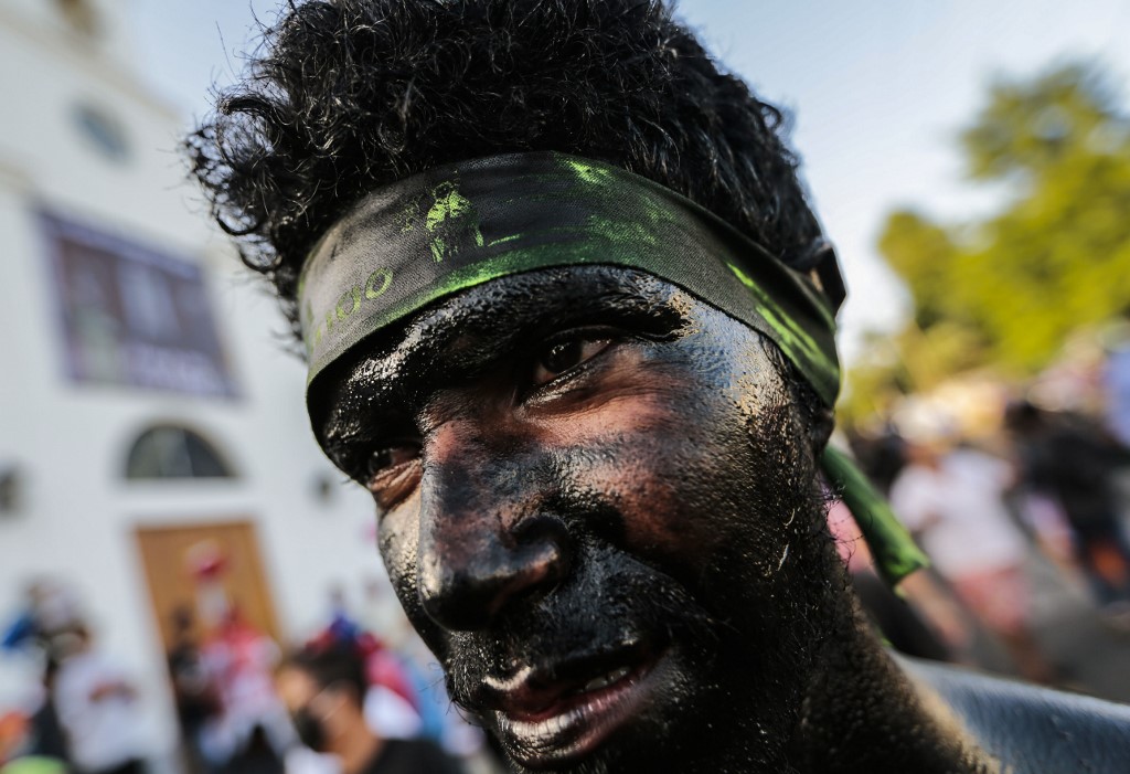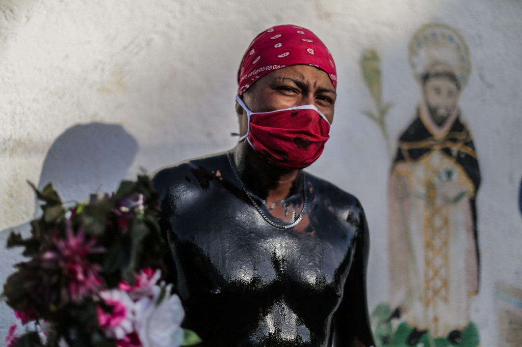 A Catholic faithful smeared in burnt oil takes part in the opening of the ten-day celebration of the Santo Domingo de Guzman festival, outside the Las Sierritas de Santo Domingo church in Managua, on August 1, 2020 amid the COVID-19 novel coronavirus pandemic. Despite the Catholic Church cancelling all religious activities due to the coronavirus pandemic, devotees gathered outside the church for the celebration. Inti OCON / AFP