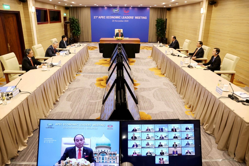 This picture taken and released by the Vietnam News Agency on November 20, 2020 shows Vietnam's Prime Minister Nguyen Xuan Phuc (C) in Hanoi, taking part in the virtual meeting between world leaders during the online Asia-Pacific Economic Cooperation (APEC) leaders' summit being held in Kuala Lumpur. STR / Vietnam News Agency / AFP