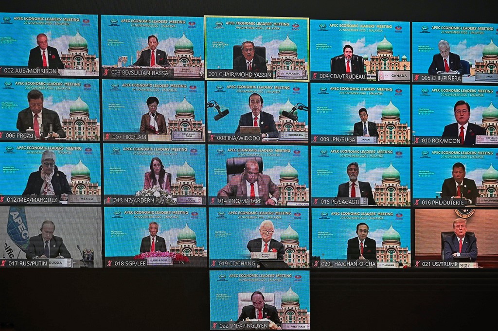 A screen shows the virtual meeting between world leaders, including US President Donald Trump (bottom R), Russian President Vladimir Putin (bottom L) and Chinese President Xi Jinping (L, second row from top), during the online Asia-Pacific Economic Cooperation (APEC) leaders' summit in Kuala Lumpur on November 20, 2020. MOHD RASFAN / AFP