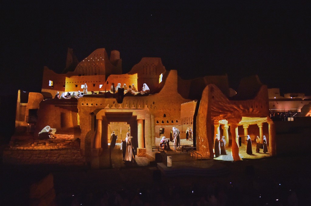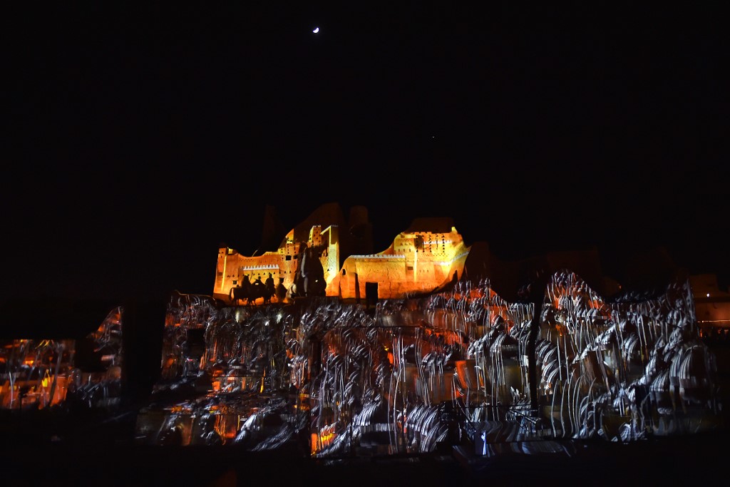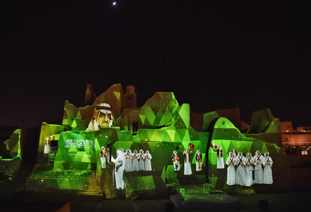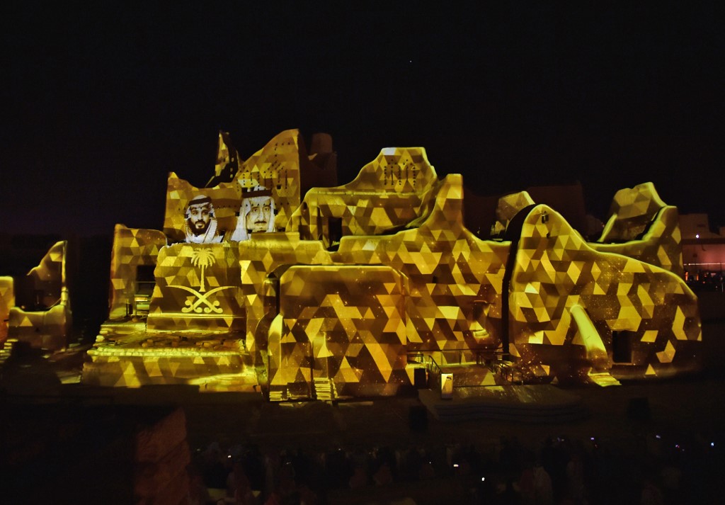 An animation is projected at the historical site of al-Tarif in Diriyah district, on the outskirts of Saudi capital Riyadh, on November 20, 2020. Saudi Arabia hosts the G20 summit on November 21 in a first for an Arab nation, with the downsized virtual forum dominated by efforts to tackle a resurgent coronavirus pandemic and crippling economic crisis. FAYEZ NURELDINE / AFP