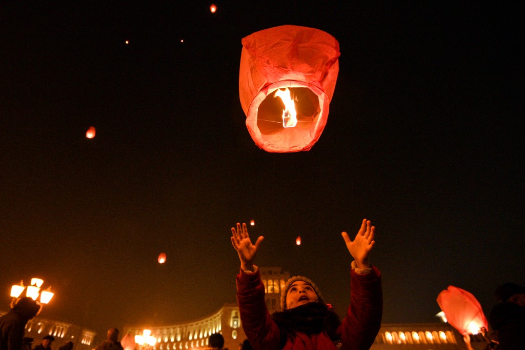 A girl launches a Chinese lantern during New Year celebrations in Yerevan early on January 1, 2021. Karen MINASYAN / AFP
