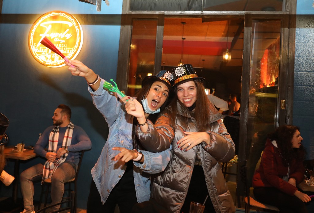 People share a drink to celebrate New Year's eve at a pub in the capital Beirut on January 1, 2021. ANWAR AMRO / AFP