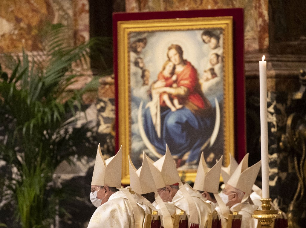 Clergy, celebrates a new year Mass in St. Peter's Basilica at the Vatican on January 1, 2021. Alessandra Tarantino / POOL / AFP
