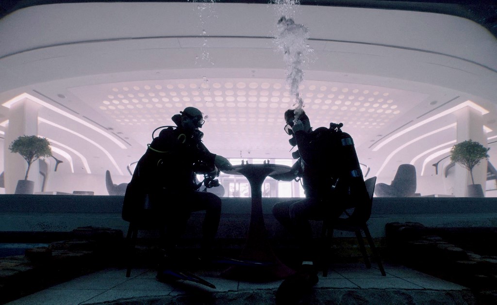 Guided down by lights and ambient music, divers can play table football and other games at the bottom as well as explore an "abandoned sunken city" or just soak up the vegetation on the way.