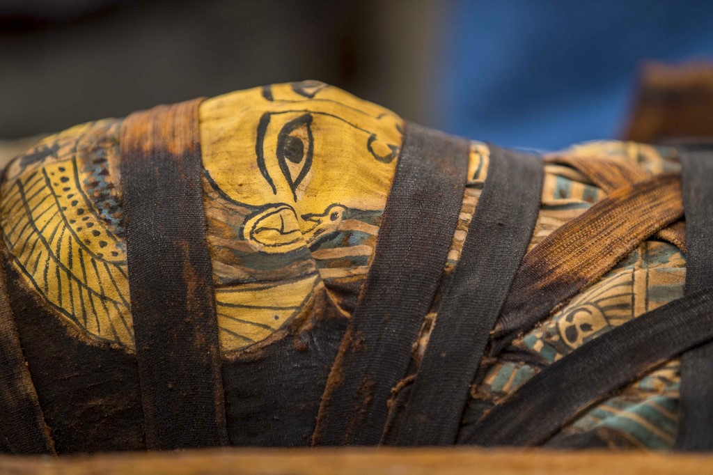 Opening one of the ornately decorated sarcophagi before assembled media, the team revealed mummified remains wrapped in burial cloth that bore hieroglyphic inscriptions in bright colours.