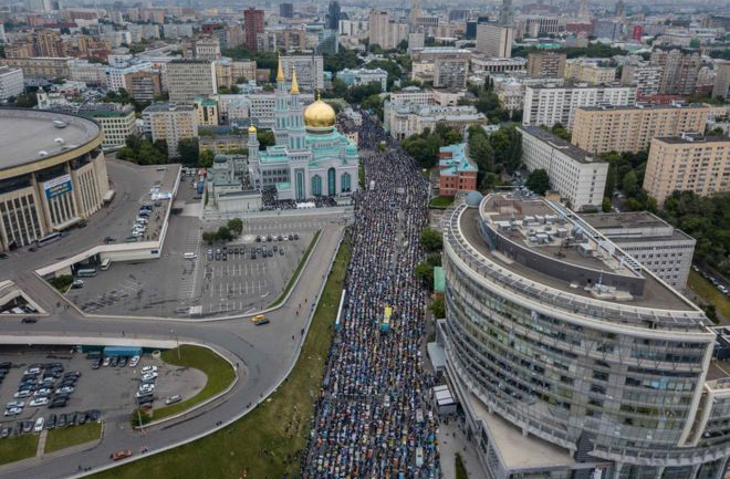Muslims pray in the streets of Moscow near the central mosque on Eid el-Fitr. Islam is the second largest religion in Russia and the predominant religion of Caucasians and Turkic people. The country also hosts many Muslim migrant workers from Central Asia.