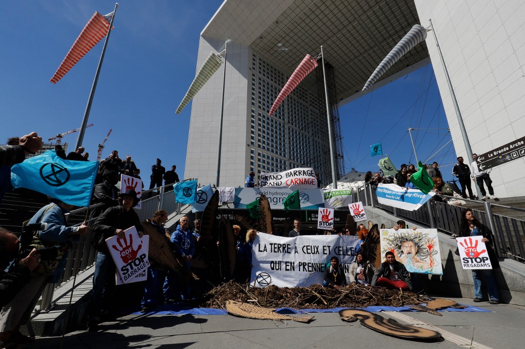 Activists of 'Extinction Rebellion' (XR) and NGO 'Planete Amazone' stage a protest against large hydroelectric dams in front of the Grande Arche de La Defense in Puteaux, northwest of Paris, on May 14, 2019, on the occasion of the 2019 World Hydropower Congress. FRANCOIS GUILLOT / AFP