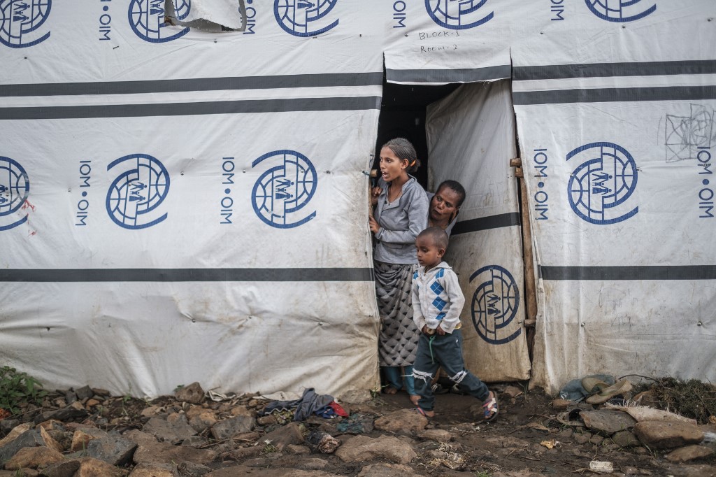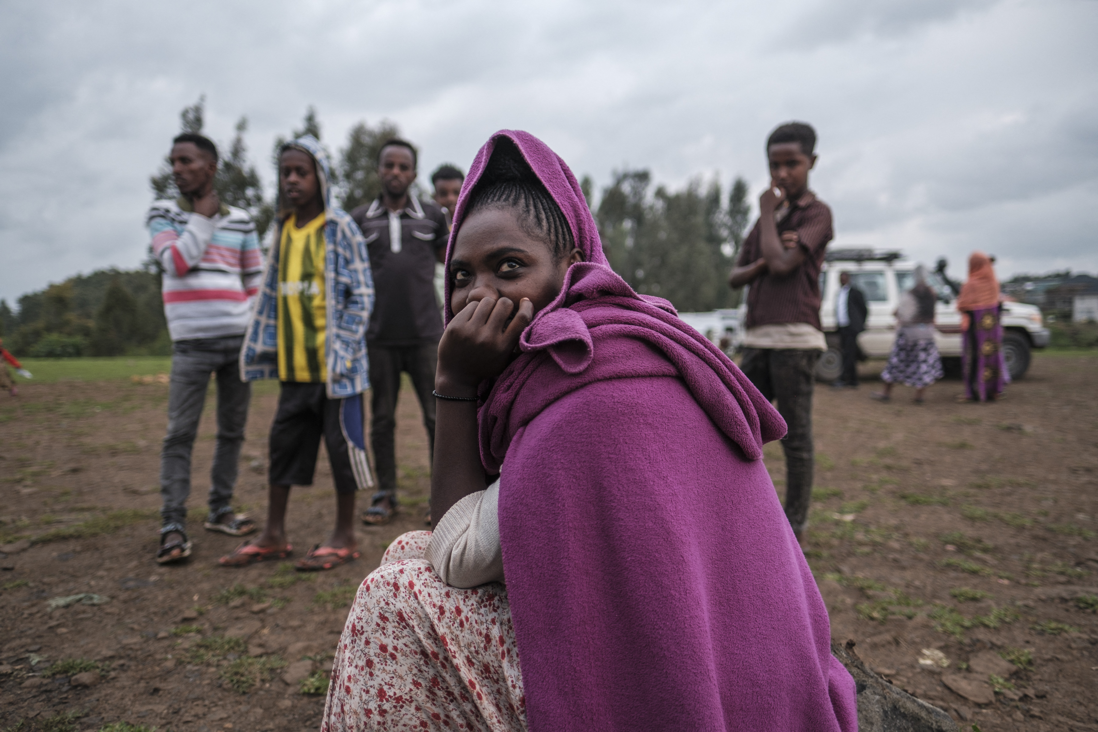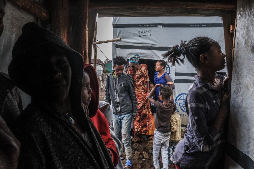 Internally displaced people protect themselves from the rain at a camp in the town of Azezo, Ethiopia, on July 12, 2021. The camp hosts Ethiopians as well as Eritrean refugees uprooted by the ongoing war in the region of Tigray. EDUARDO SOTERAS / AFP