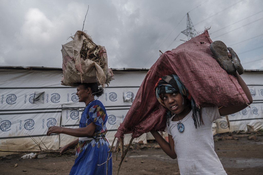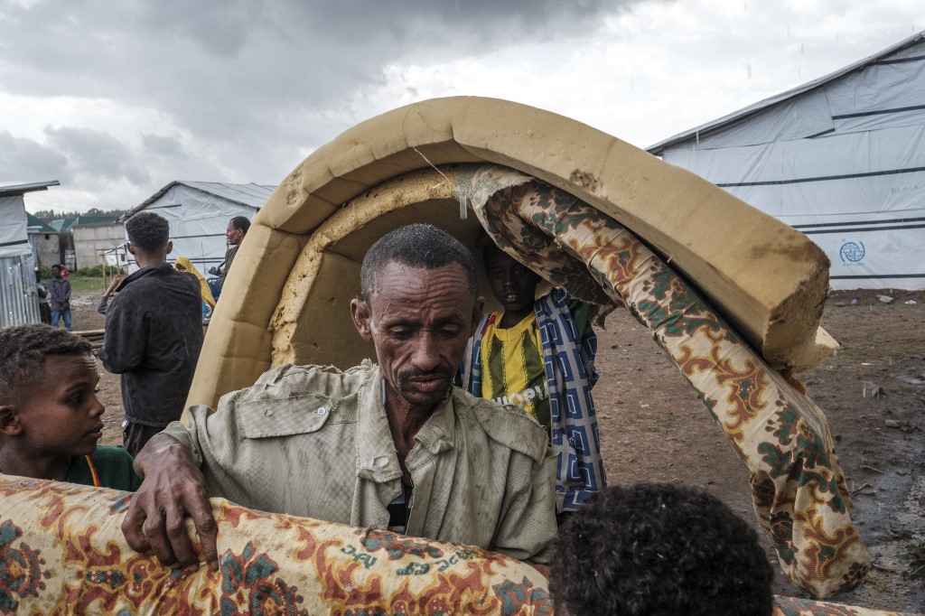 Internally displaced people move recently received mattresses from and aid organization as rain falls at a camp in the town of Azezo, Ethiopia, on July 12, 2021. The camp hosts Ethiopians as well as Eritrean refugees uprooted by the ongoing war in the region of Tigray. EDUARDO SOTERAS / AFP