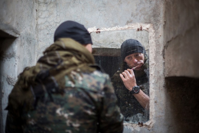 A 33-year old from New Zealand, nick-named by Kurdish fighters as ‘Hewal Welat,’ brushes his teeth on April 17, 2015 just outside Tal Tamr.