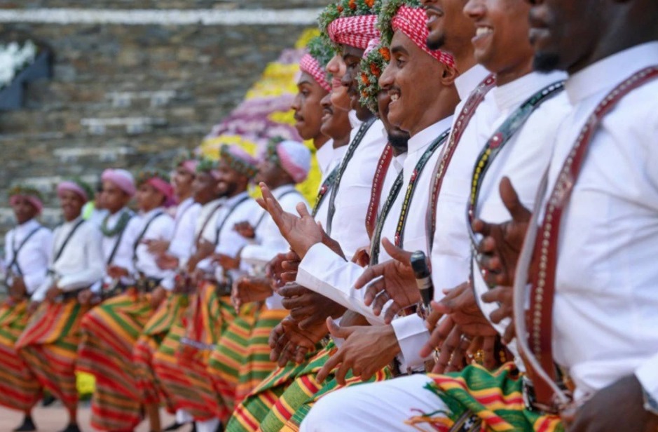 'Flower men', a tribe of people descended from the ancient Tihama and Asir groupings and whose traditions, most strikingly the garlands of herbs and blooms they wear, date back more than two millennia. They go into the foothills of the Habala Mountains every morning in search of fresh herbs for their garlands.
